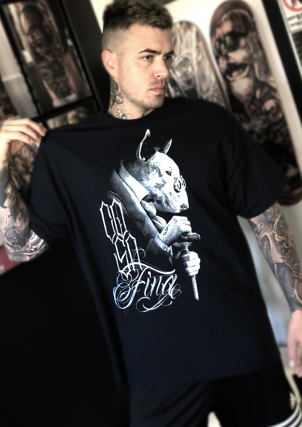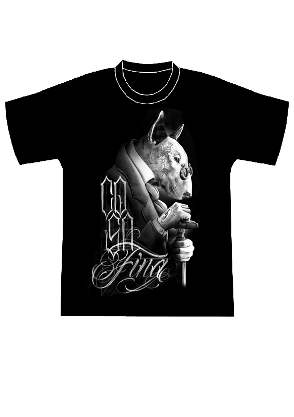 Estampado blanco con diseño exclusivo de Carlos Fabra de Bull Terrier elegante de perfil con lettering de CosaFina