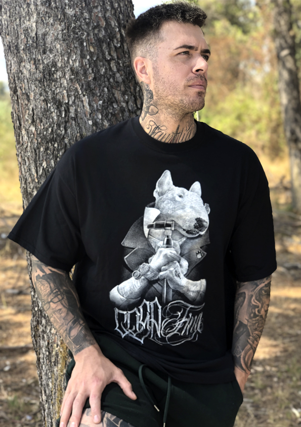 Estampado blanco con diseño exclusivo de Carlos Fabra del Remake de Bull Terrier y lettering con toques de Dragon Ball.