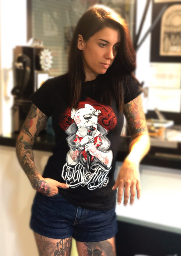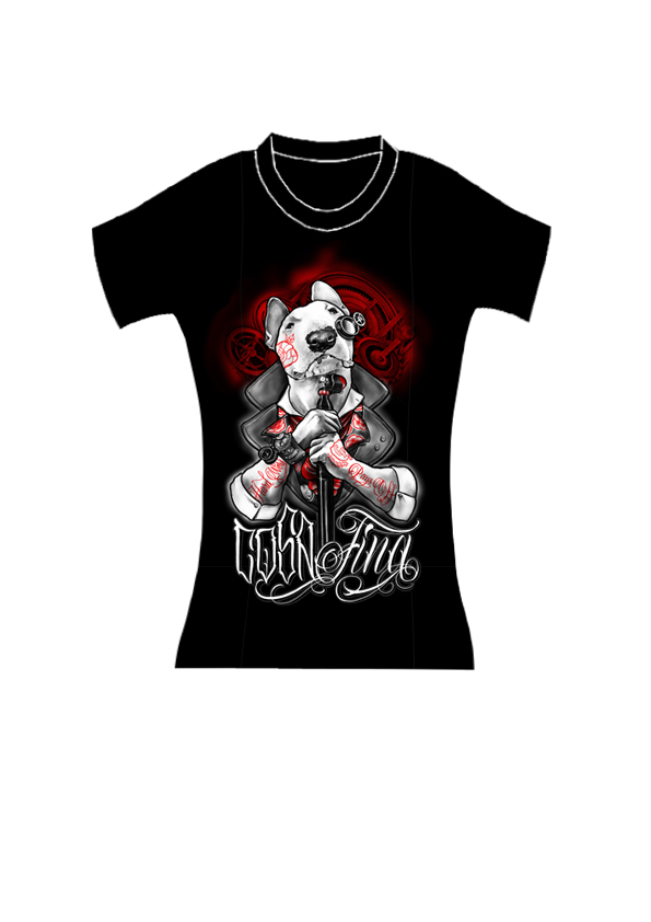 Estampado blanco y rojo con diseño exclusivo de Carlos Fabra de Bull Terrier elegante con engranajes y lettering de CosaFina