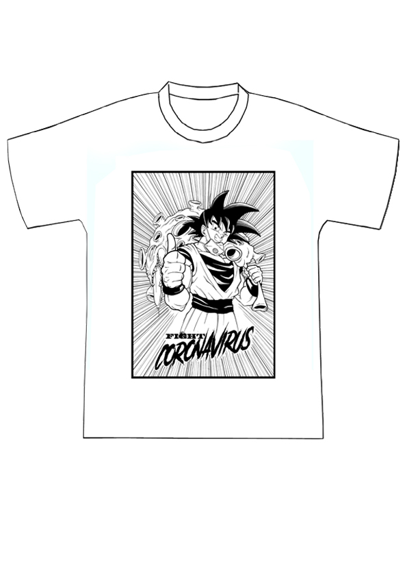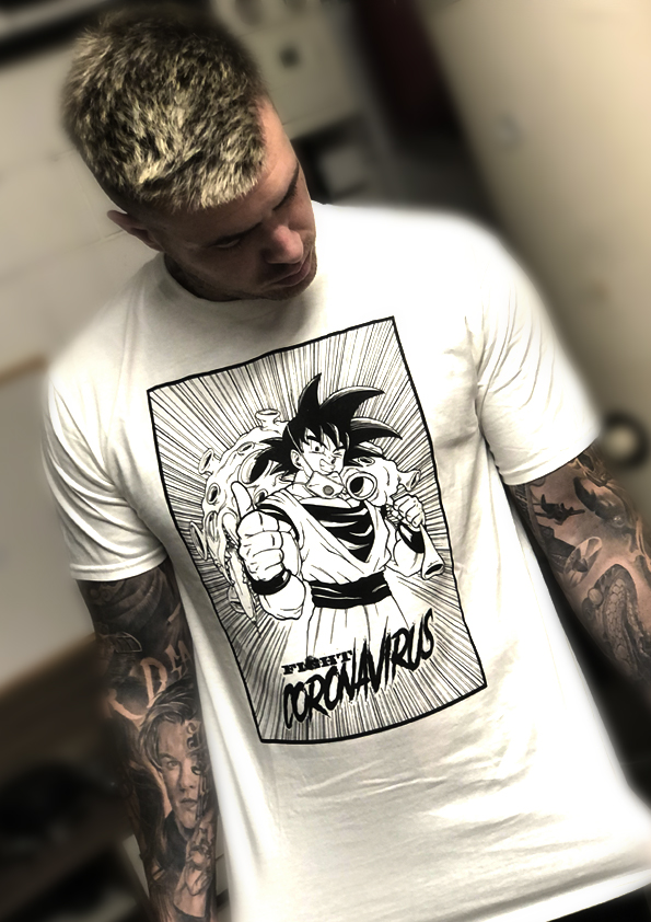 Estampado negro con diseño exclusivo de Carlos Fabra de Goku de Dragon Ball luchando contra el Coronavirus