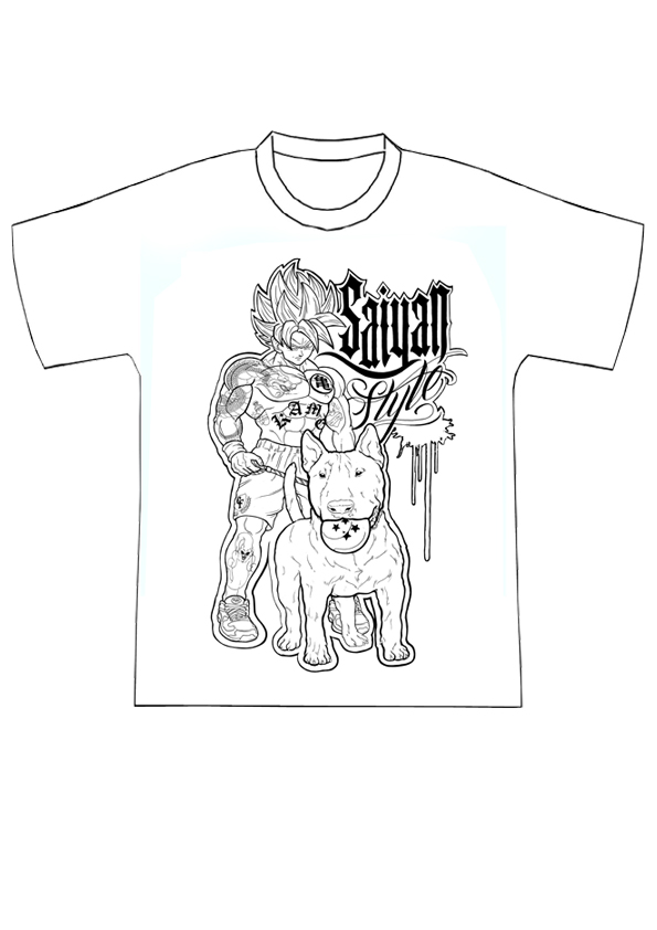 Estampado negro con diseño exclusivo de Carlos Fabra de Goku de Dragon Ball tatuado, con Bull Terrier y lettering.