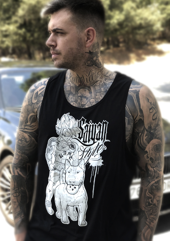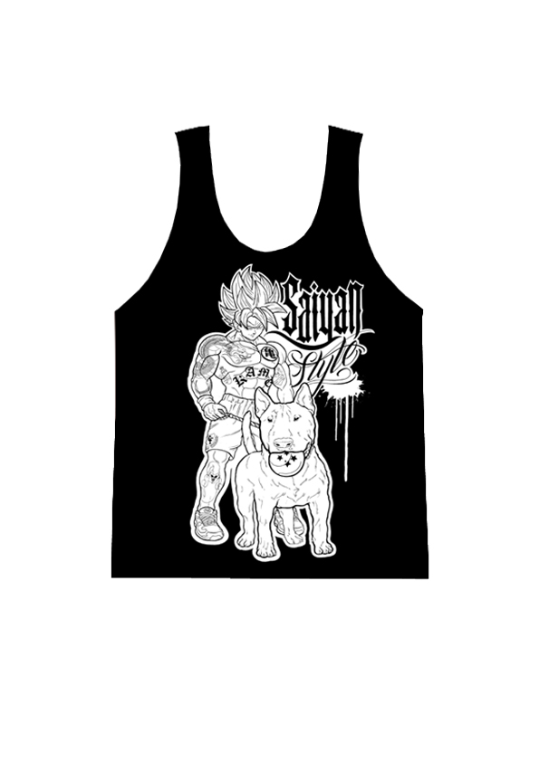 Estampado negro con diseño exclusivo de Carlos Fabra de Goku de Dragon Ball tatuado, con Bull Terrier y lettering.