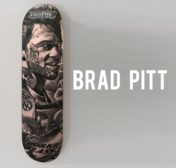 Tabla decorativa de la marca “Skateink designs” con diseño exclusivo del tatuaje de Brad Pitt “Working Class” realizado por el artista Carlos Fabra.