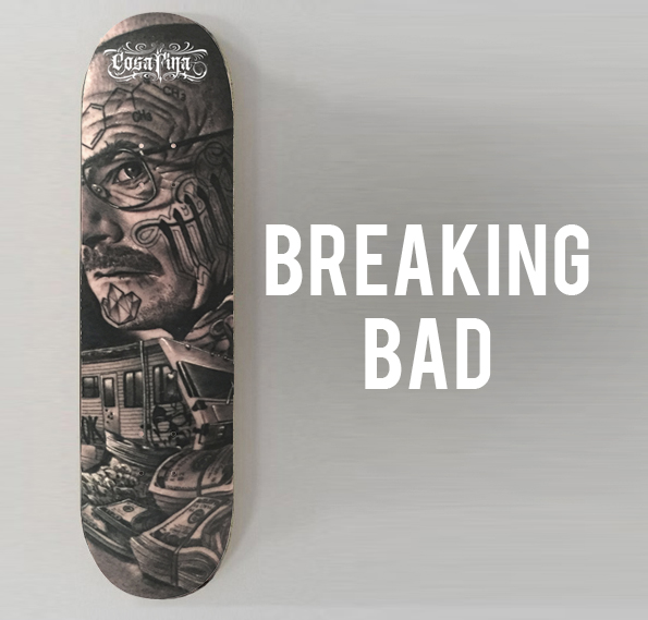 Tabla decorativa de la marca “Skateink designs” con diseño exclusivo del tatuaje de Breaking Bad realizado por el artista Carlos Fabra.