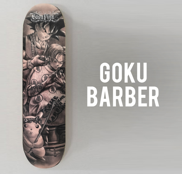 Tabla decorativa de la marca “Skateink designs” con diseño exclusivo del tatuaje de “Kame Hame Barber Shop” realizado por el artista Carlos Fabra.